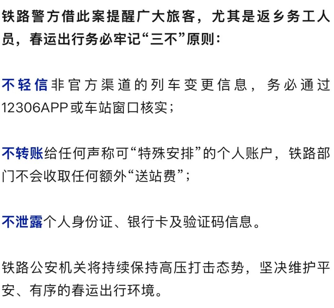 经后续工作发现,该诈骗团伙专门在火车站周围物色年龄偏大、行李较多、看似焦急的返乡人员。一名嫌疑人先以“热心帮忙”为由接近,搭讪中谎称被害人购买的车次因“天气原因停运”或“车辆故障无法开行”,随后另一嫌疑人接近两人表示自己“认识车站领导”,可以“特殊安排”送其进站上车,但需支付“送站费”。