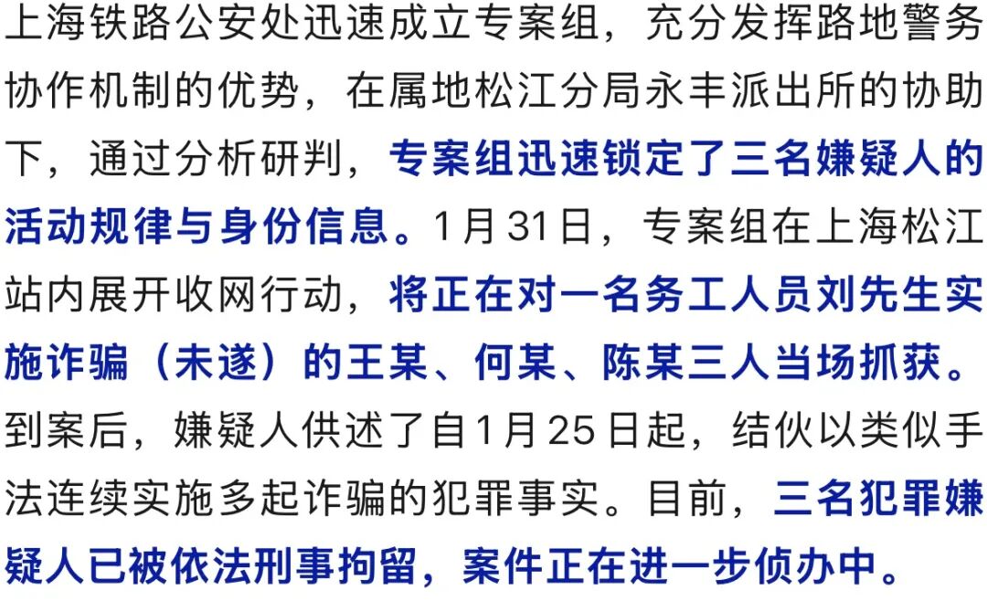 近日,上海铁路公安处成功破获一起在火车站周围以“火车停运”“车辆损坏”为幌子、专门针对返乡务工人员实施诈骗的案件,抓获犯罪嫌疑人3名,初步查证涉案金额达1万余元。