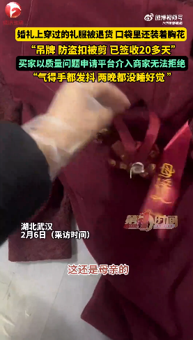 近日,湖北武汉一店家发布视频称买家婚礼上穿过的礼服被退货,“吊牌、防盗扣被剪,已经签收20多天,口袋里还有胸花”,买家以质量问题申请平台介入商家无法拒绝,把商家气得手发抖,两晚没睡好。