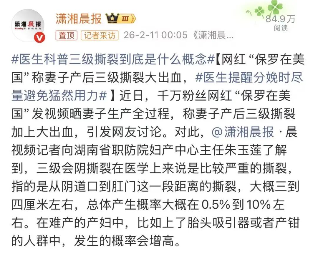 据此前报道,今年2月,“保罗在美国”发布妻子生产视频,称产程长达23小时,妻子三级撕裂、产后大出血,失血量达3344毫升,经紧急手术与输血后脱离危险,母女平安。
