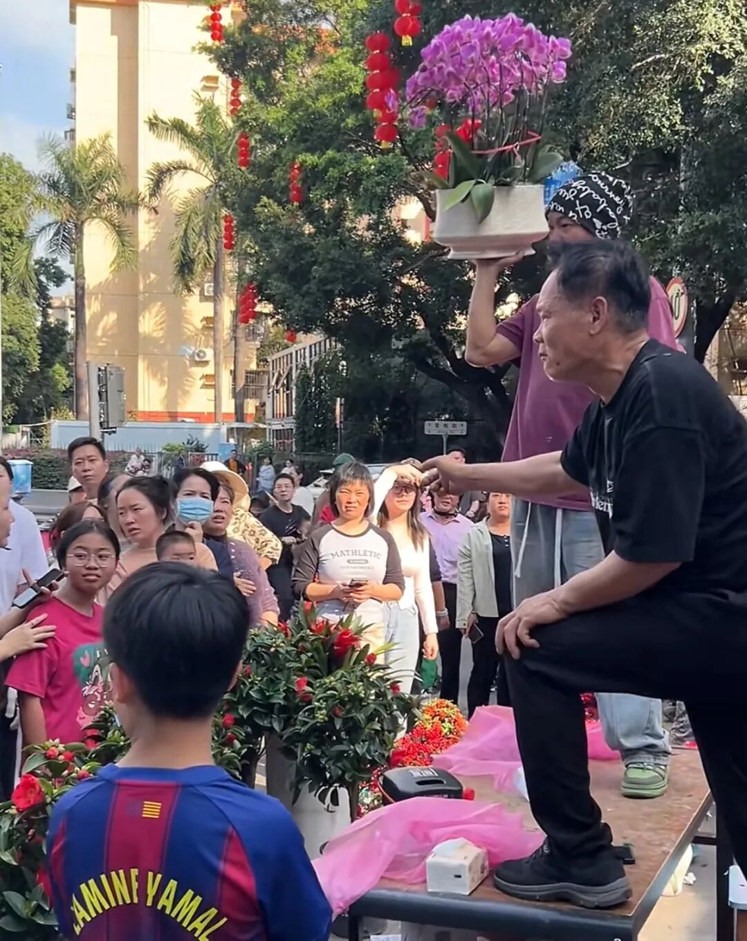 视频拍摄于深圳蛇口一家花店门口,两名男子站在凳子上,周围摆满各式花卉。一名年轻男子捧着一盆蝴蝶兰从250元开始喊价,降到230元后,中年男子接过花直接喊出120元,围观人群中立刻有人举手拍下,现场顿时响起一片掌声和叫好声。