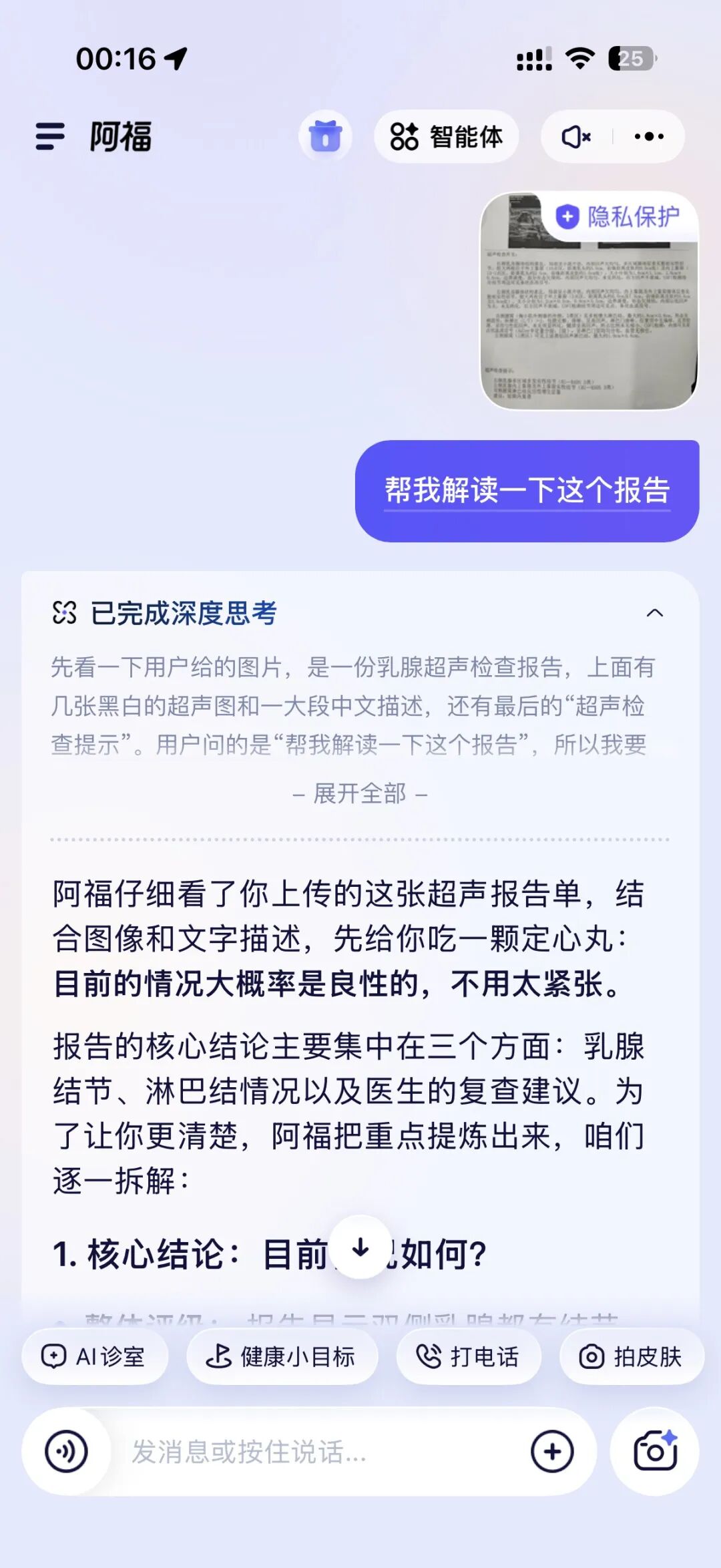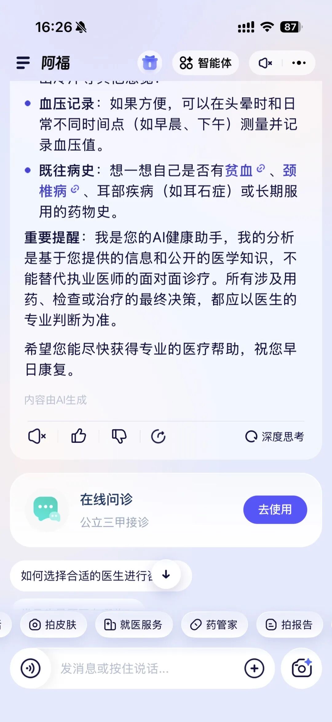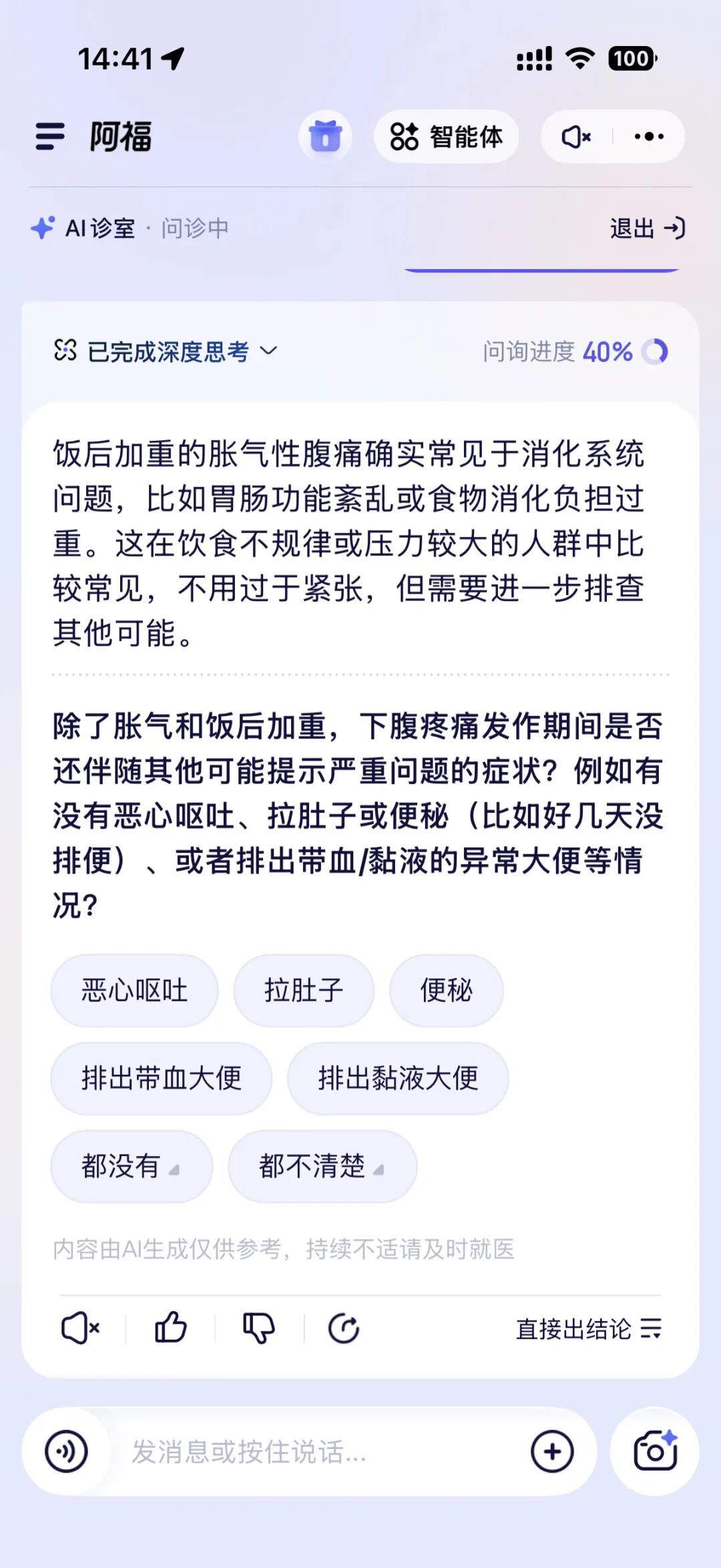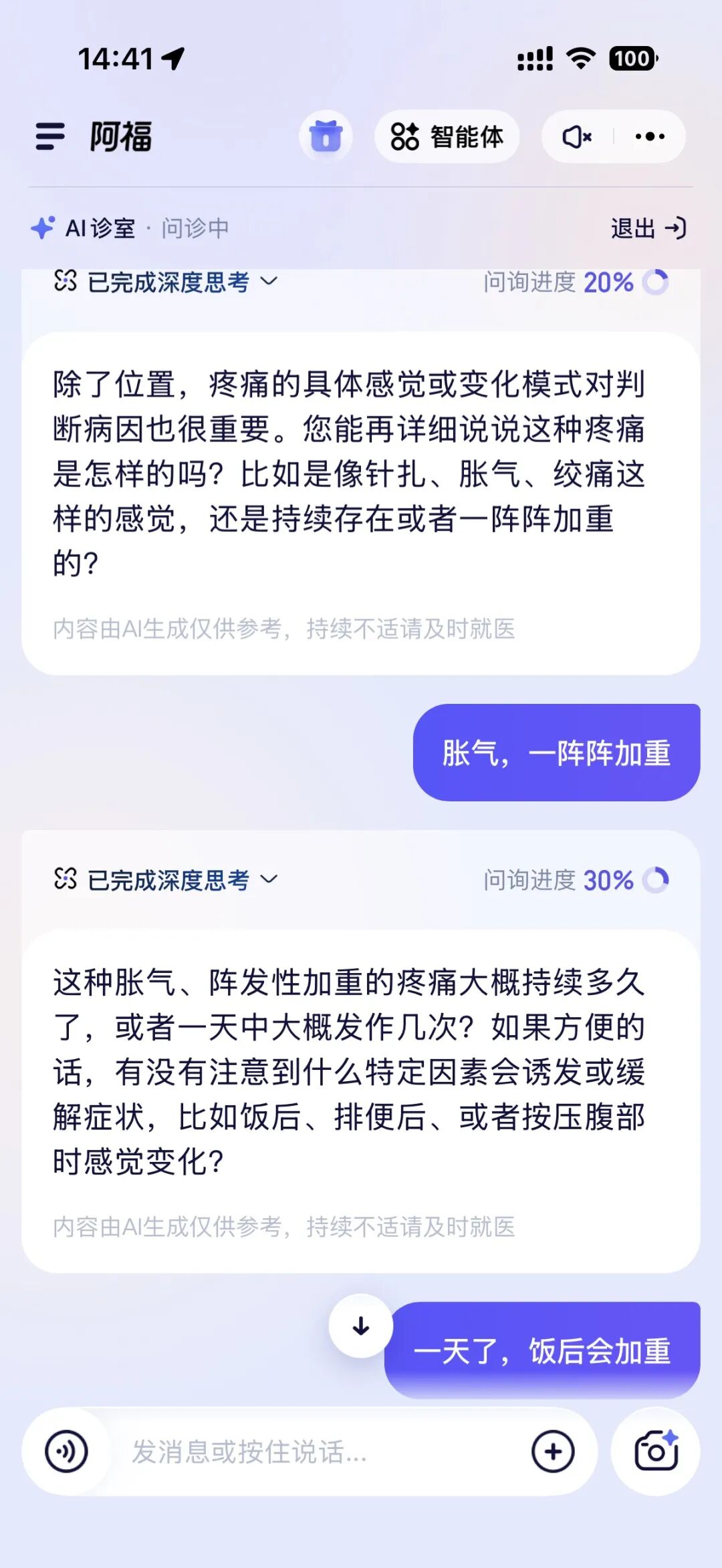 阿福的处理方式不太一样。用户描述症状后,它会反问细节:具体哪个位置疼?持续多久了?有没有其他不舒服?像医生面诊一样,等这些信息收集齐了,再给出判断和建议。