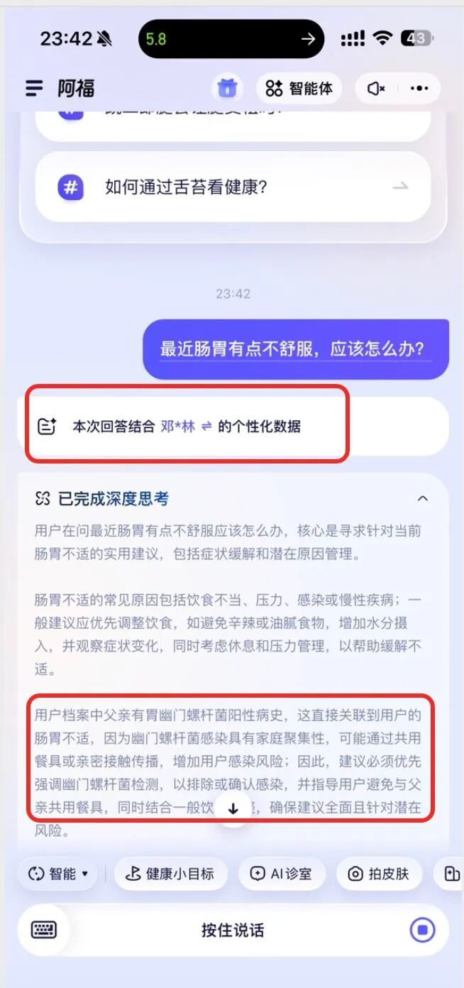 用过其他AI的应该都有这种体验:问“肚子疼怎么办”,直接甩一篇百科过来,看完更慌了。
