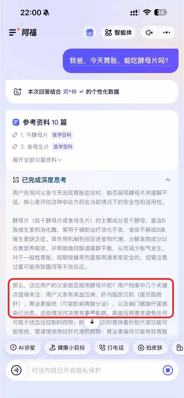 把过往的病历、体检报告、用药记录上传建档后,后续提问会自动带上这些背景信息。比如问“我爸这两天胃胀,能吃这个药吗”,系统会结合之前上传的病史和用药情况来综合判断。