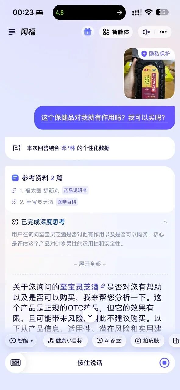 但比起这些热度,更值得关注的是它的产品定位——与偏娱乐化、工具化的其他AI不同,阿福聚焦的是“健康”这个垂直场景。