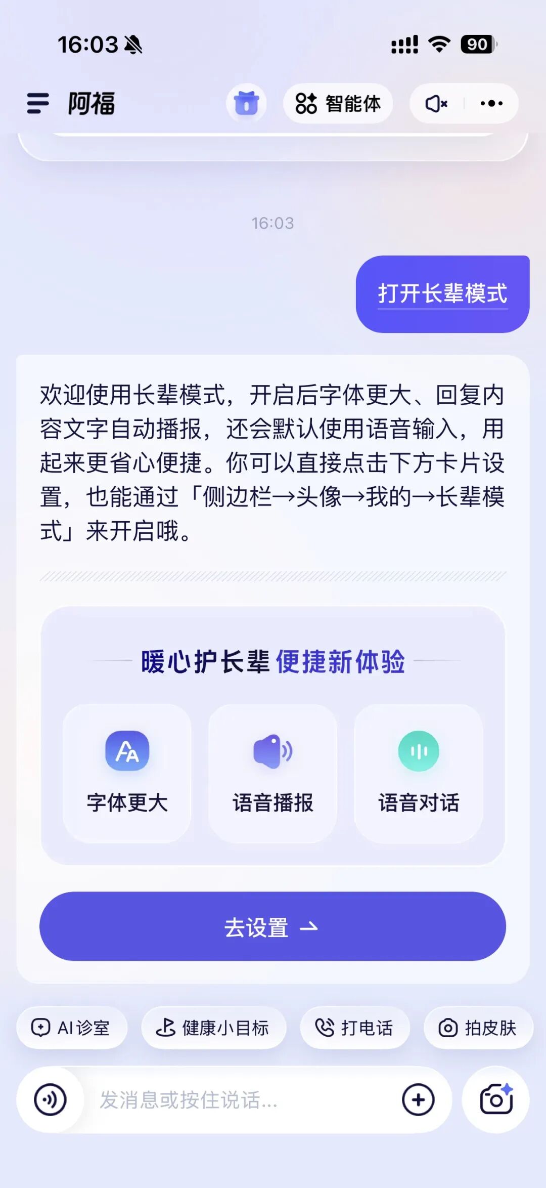 阿福专门做了长辈模式:字体巨大、支持语音播报、还能听懂十几种方言。普通话不标准没关系,用家乡话问同样能接住。