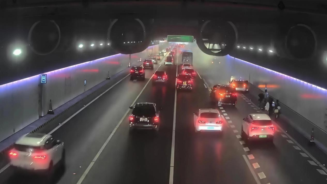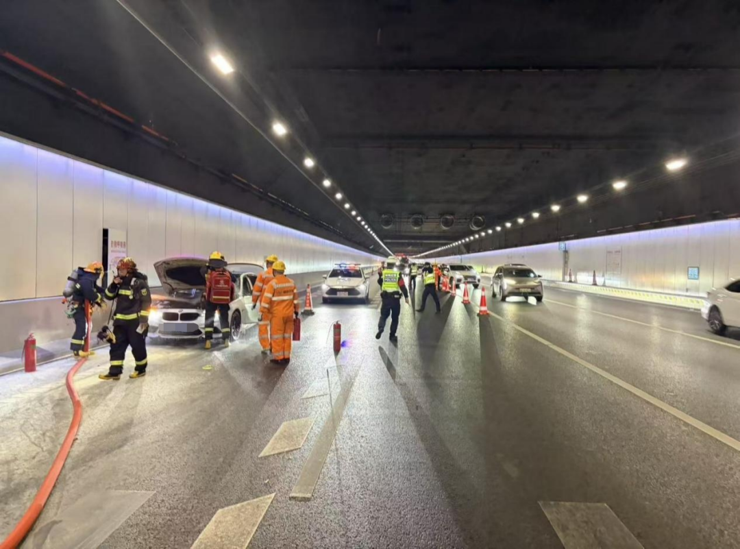 随后,救援力量陆续抵达。交警、路政人员对第四车道及应急车道实施临时交通管制,在车辆后方设置警戒区与警示标识,利用防撞车进行远端预警,引导后方车流有序避让;消防人员使用水枪对车辆进行降温冷却,并对现场进行排查,确保无其余隐患;隧道运维团队根据现场情况,及时开启隧道排风系统,加快烟雾扩散区域的空气流通,最大限度降低烟雾对行车视线的影响,保障通行安全。