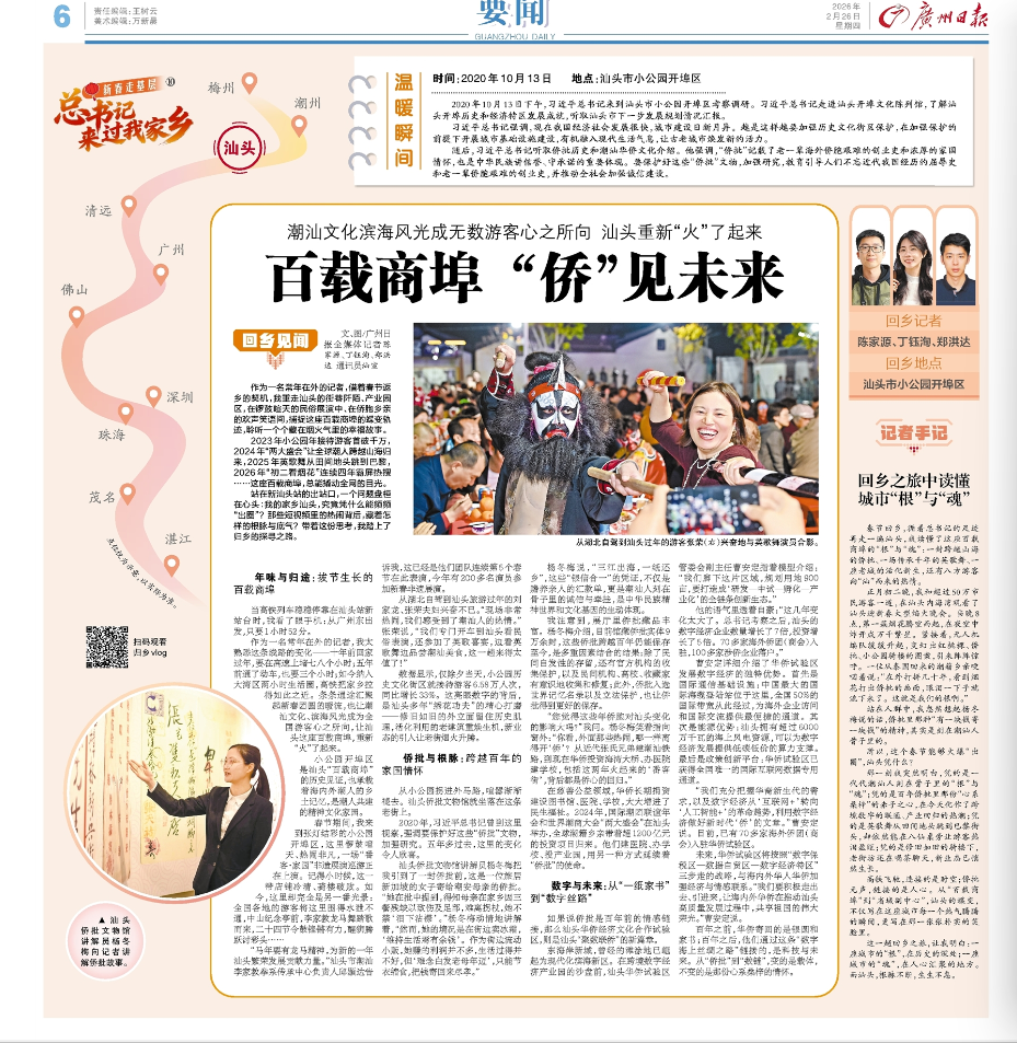 高铁飞驰,连接的是时空;侨批无声,链接的是人心。从“百载商埠”到“省域副中心”,汕头的蝶变,不仅写在这座城市每一个热气腾腾的瞬间,更写在那一张张朴实的笑脸里。