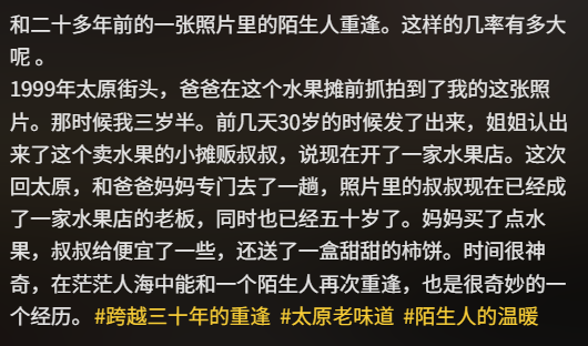 近日,一段跨越27年的重逢故事在抖音刷屏,温暖了无数网友。一位博主将1999年与2026年在山西太原拍摄的两张照片同框对比,竟与3岁半时偶遇的水果摊摊主奇妙重逢,旧时光与新生活撞了个满怀。视频一经发布,迅速收获超30万点赞、5000余条评论,成为这个春天最动人的暖心瞬间。 两张照片对比