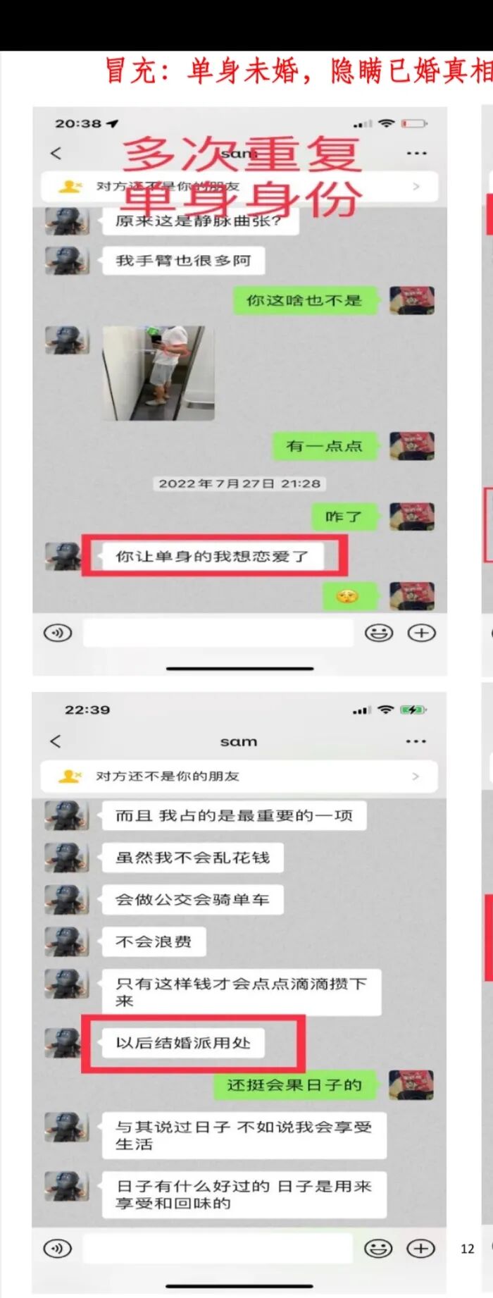 2022年4月,孙女士在网上为一名发布求助信息的网友提供帮助,二人就此微信相识,彼时正值上海特殊时期,居家办公的孙女士也因此有了更多线上交流的时间,而这名求助者正是早已结婚的周某。自相识起,周某便开始向孙女士刻意编织全套虚假身份,谎称自己单身未婚、本科毕业于同济大学,还是澳大利亚的在读留学生,在海外攻读硕士的同时兼职导游补贴生活,刻意打造出努力上进、阳光真诚的优质青年形象,却对其2013年2月2日便与黄某俊登记结婚的核心事实绝口不提。孙女士对记者表示,周某的妻子黄某俊和朋友孙某茜二人也曾配合周某参与到这场虚假人设的打造中,让其一步步陷入骗局。
