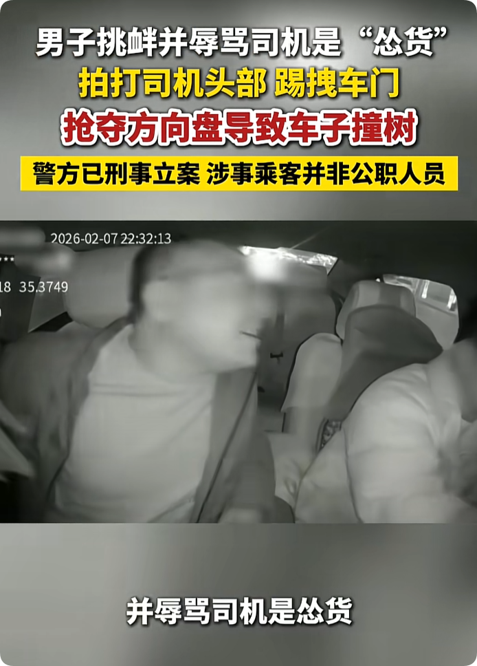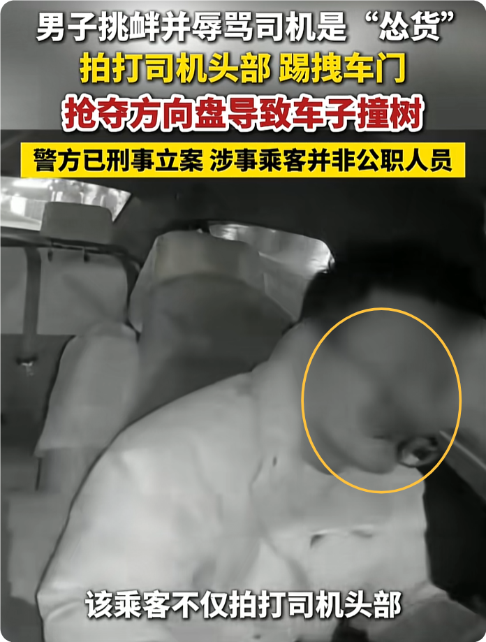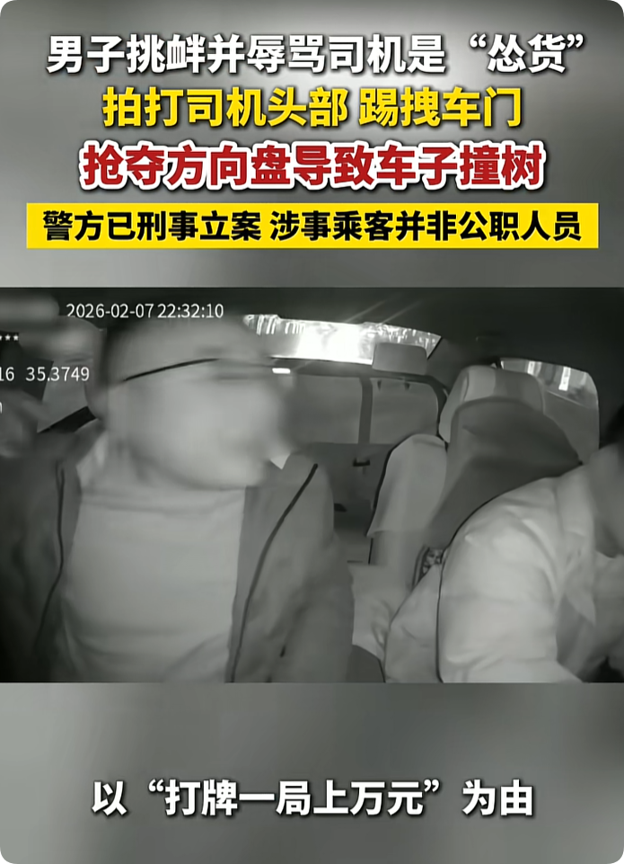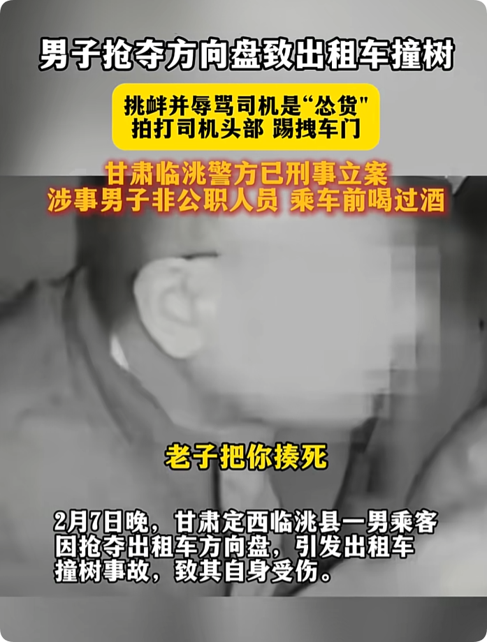 春节这几天大家胡吃海喝,各种饭局应酬多的数不过来。 一些饮酒过度的人,就容易失去品性。 2月7号晚10点半,甘肃临洮县,一名男子酒过三巡准备回家,叫了一辆的士坐副驾驶位子。 本来吧喝醉了就要老老实实,让司机将你安全送回家就好了, 可是这名醉酒的男子很奇怪,上车不断挑衅的士司机,质问“打牌一局上万元,你能打几局。” 见司机没有搭理自己,于是不断用言语辱骂、嘲讽司机“怂货”。 这名男子上车一身酒味,司机不想过多的搭理,只想正常营运送他归家,只求乘客不要无理纠缠。 可是这名男子态度嚣张,持续的对司机一顿输出。 司机真心无法忍受这样的人,于是说了句:你要坐车就好好坐,不坐你给我下去。 醉酒男子更上头更来事了,直接伸手拍打司机脑袋,把司机的眼镜都打歪了。 司机扶了扶眼镜继续开车,也不敢再说什么话刺激男子。 接着男子威胁司机:你敢再说一句,揍死你,信吗? 话一说完,男子突然情绪失控,伸手抓着司机的右手,并且抢夺司机的方向盘,干扰的士正常行驶。 紧接着车辆失控撞向树上,停车后男子踢踹车门跳车逃离。 采访时司机说:大闹一片空白,至今后怕。 【网友热议】 “出租车是客运车辆!抢夺客运车辆方向盘!造不造成事故都是犯法的!” “真刑!这家伙的日子越来越有判头了!” “抢夺方向盘,这是妥妥的危害公共安全啊,三年起步。” 【写在最后】 敢抢方向盘,就是在拿人命当儿戏,必须依法严惩,才能给所有人一个安全的出行环境。 这种极端冲动、无视规则的人,真的太可怕了。