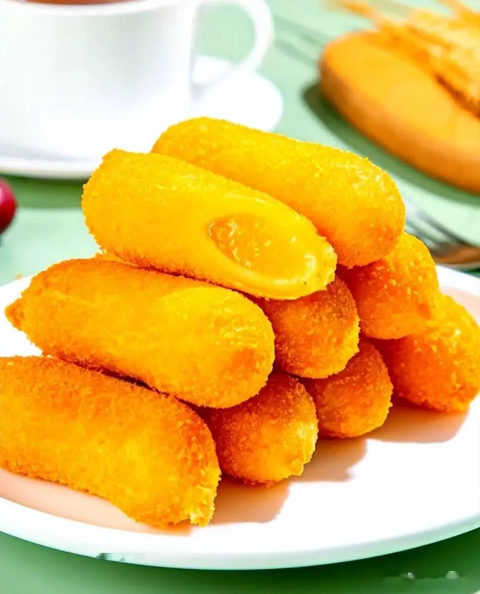 6. 将裹好面包糠的香蕉段逐个放入油锅中,小火炸至表面金黄,捞出沥干油分。