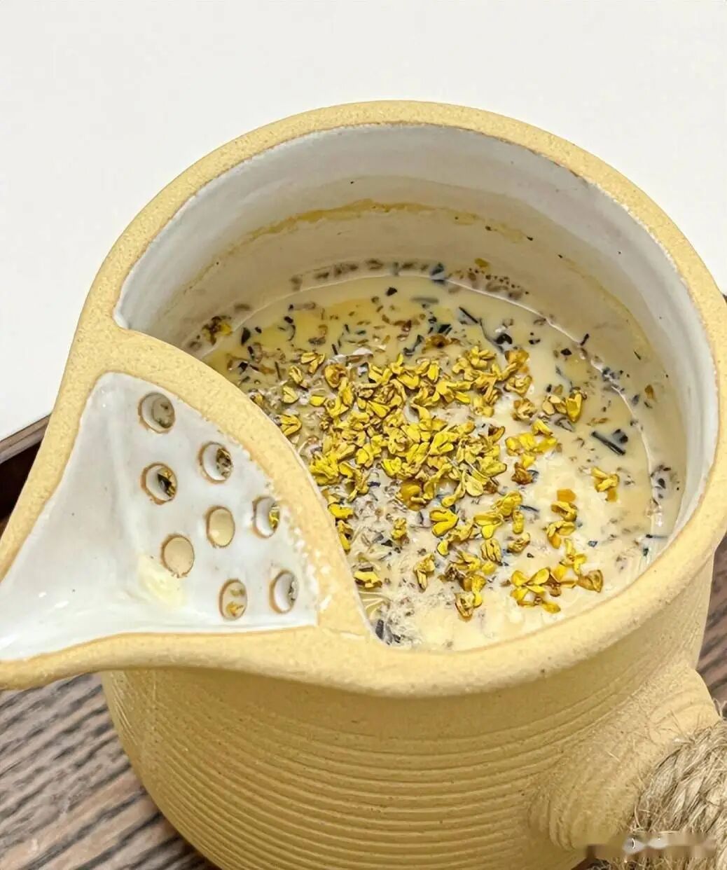 4. 将煮好的奶茶过滤掉杂质,倒入烤碗中。