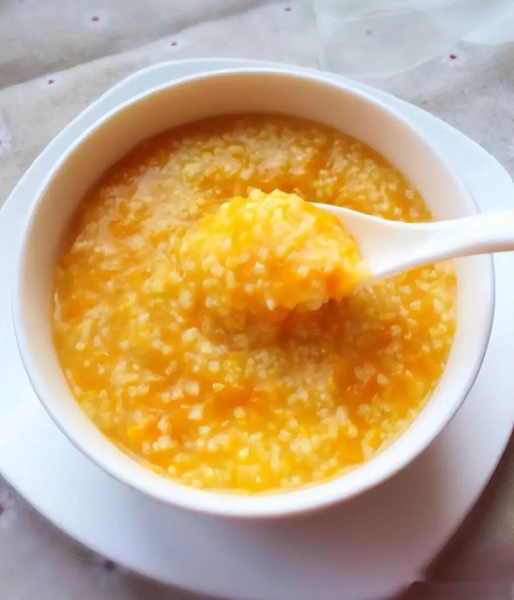 6. 用勺子将南瓜压碎,与小米充分融合。