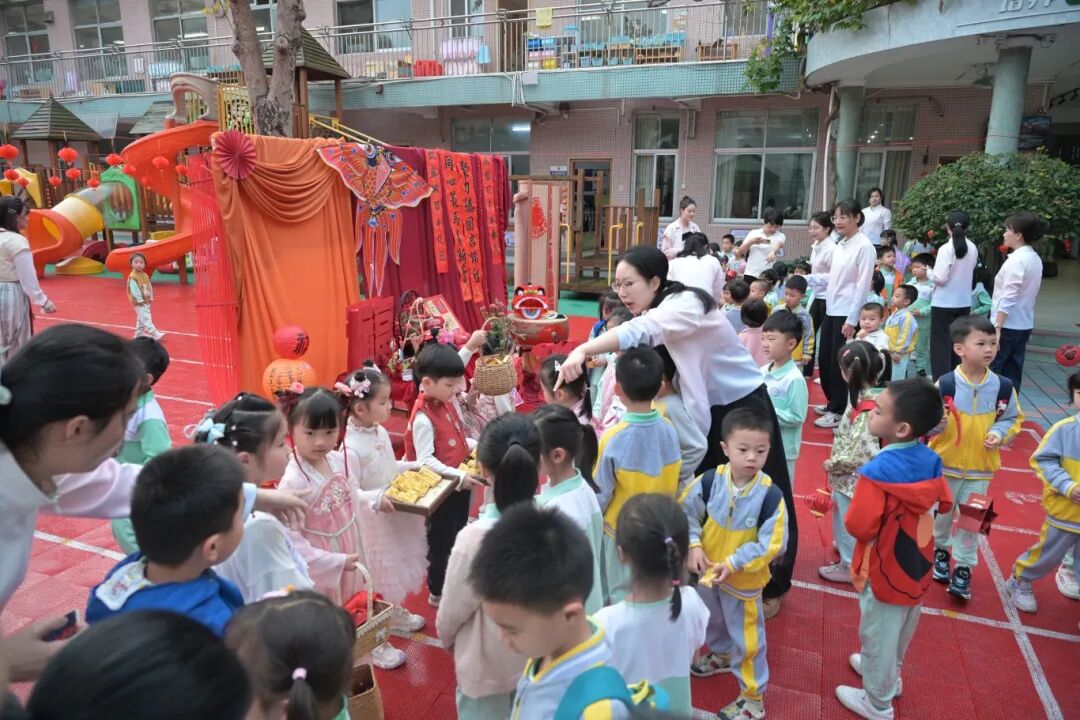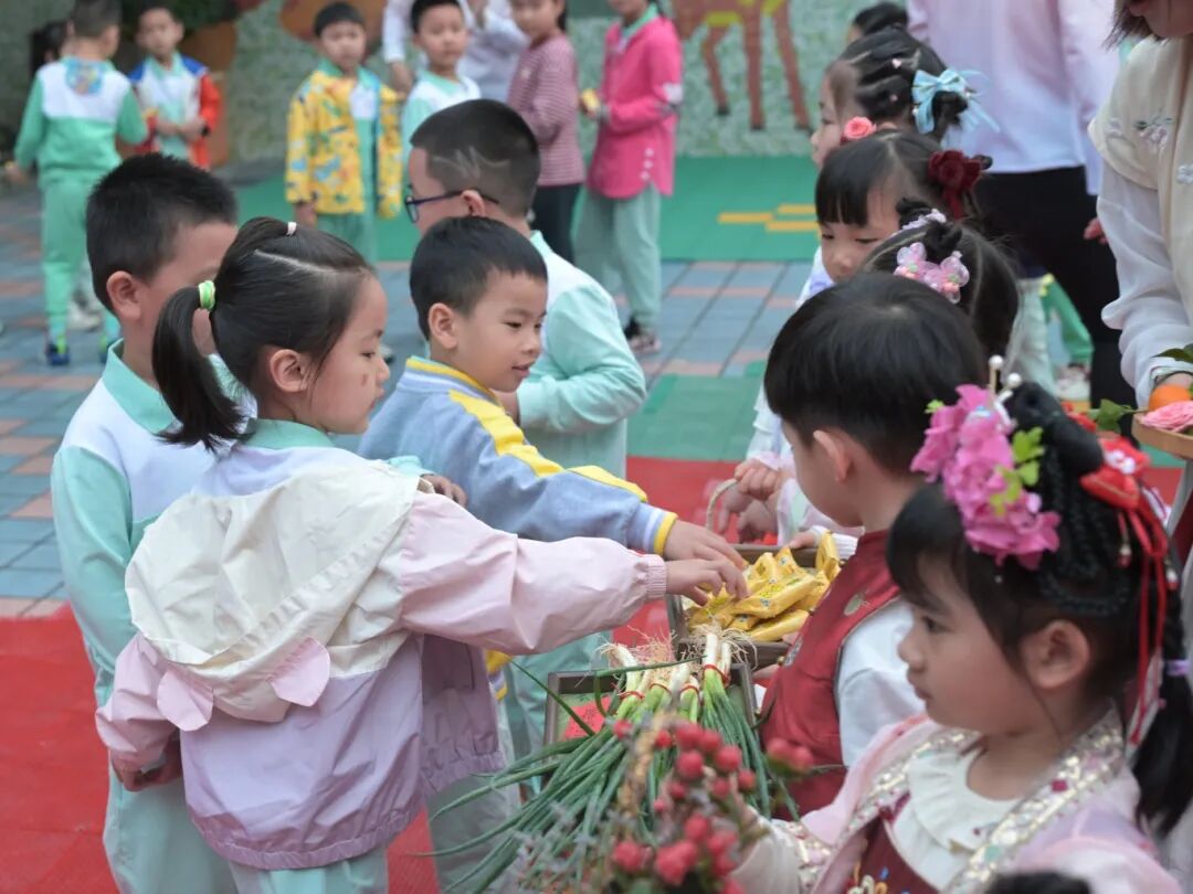 清晨的幼儿园门口,吉祥果点整齐摆放,身着精美服饰的“十二小花神”笑意盈盈,为入园的孩子们送上新春祝福。软糯的祝福话语、可爱的吉祥贴纸,瞬间消融了孩子们的入园陌生感。