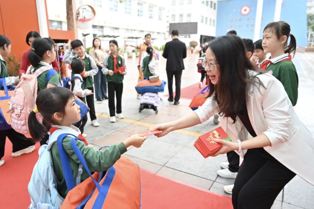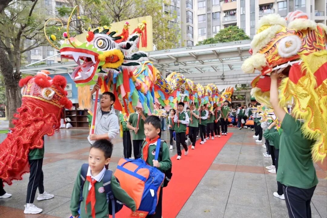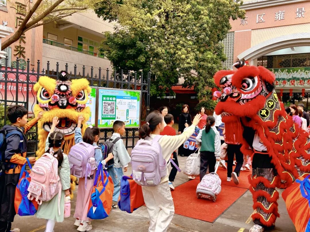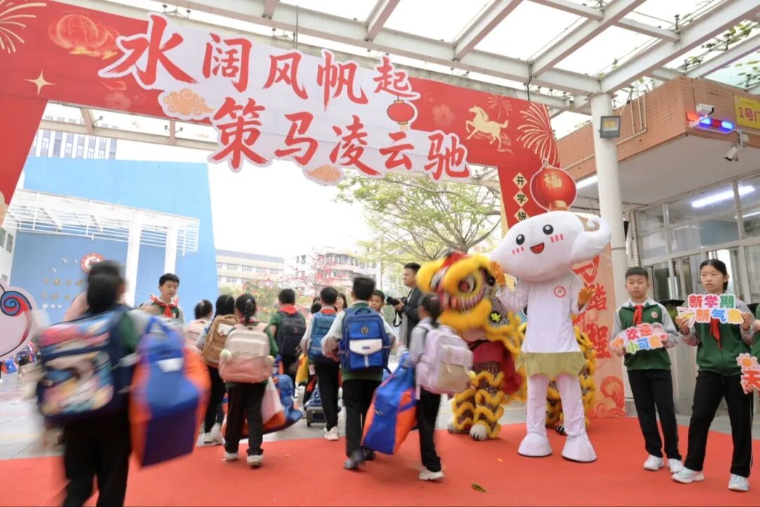 早上7点半,水云轩小学校园内已是一派热闹景象。师生齐舞的金龙醒狮昂首阔步,在校园门口与中心广场喜迎师生返校;学校行政团队早早守候在校门口,为孩子们派发寓意吉祥的新年红包;少先队员们则化身“水云宝宝”吉祥物,用热情的笑容与活泼的互动,让每一位同学都感受到了浓浓的开学氛围。