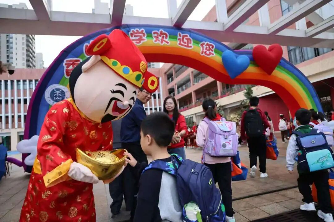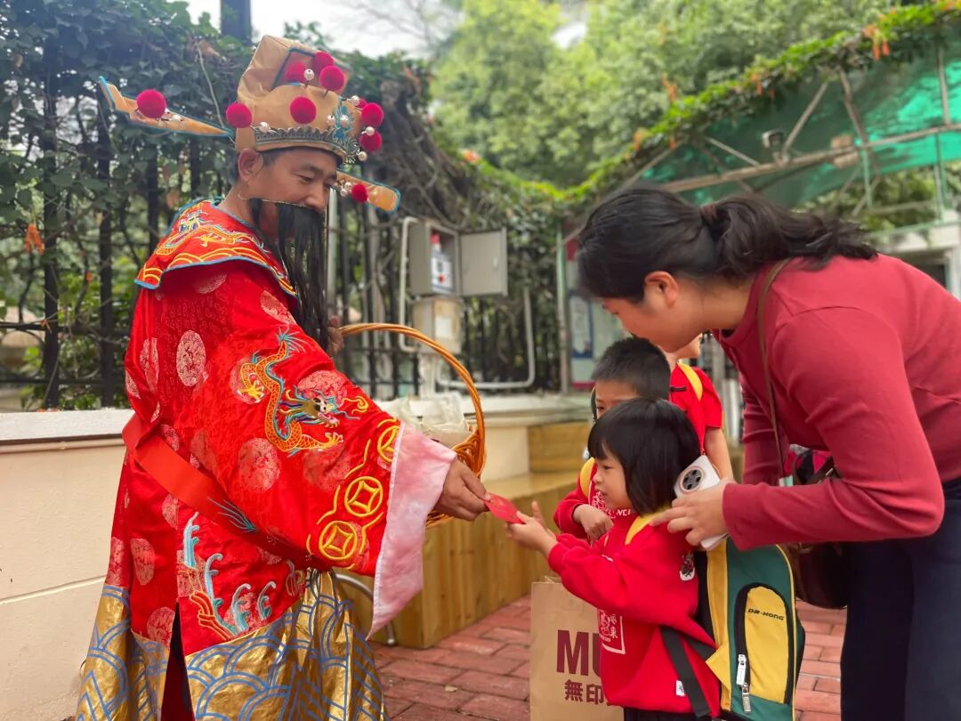 清晨7时半,校门口处,红彤彤的拱门矗立两侧,集福墙整齐摆放,财神爷装扮的老师热情引导学生跳福格,民乐团奏响《步步高》,悠扬的旋律回荡校园。
