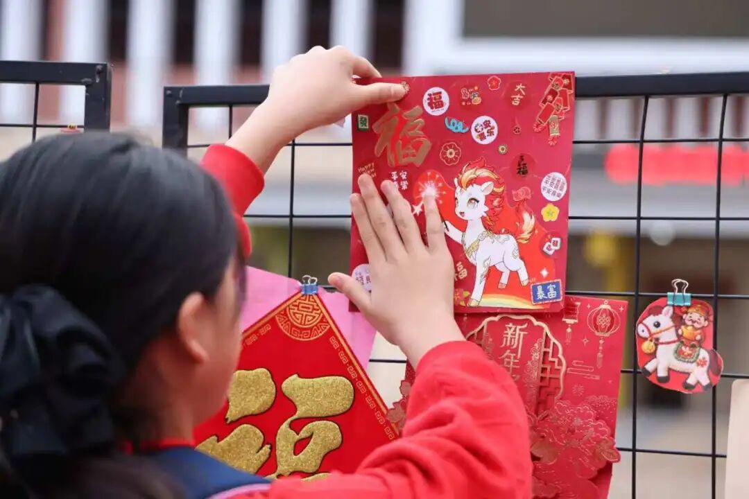 行政老师们手持棒棒糖,微笑着向每一位学生问好,书法校队的同学挥毫泼墨,书写福字赠给师生,同学们有序贴上自己精心准备的“福”字,整个校园满是欢声笑语。