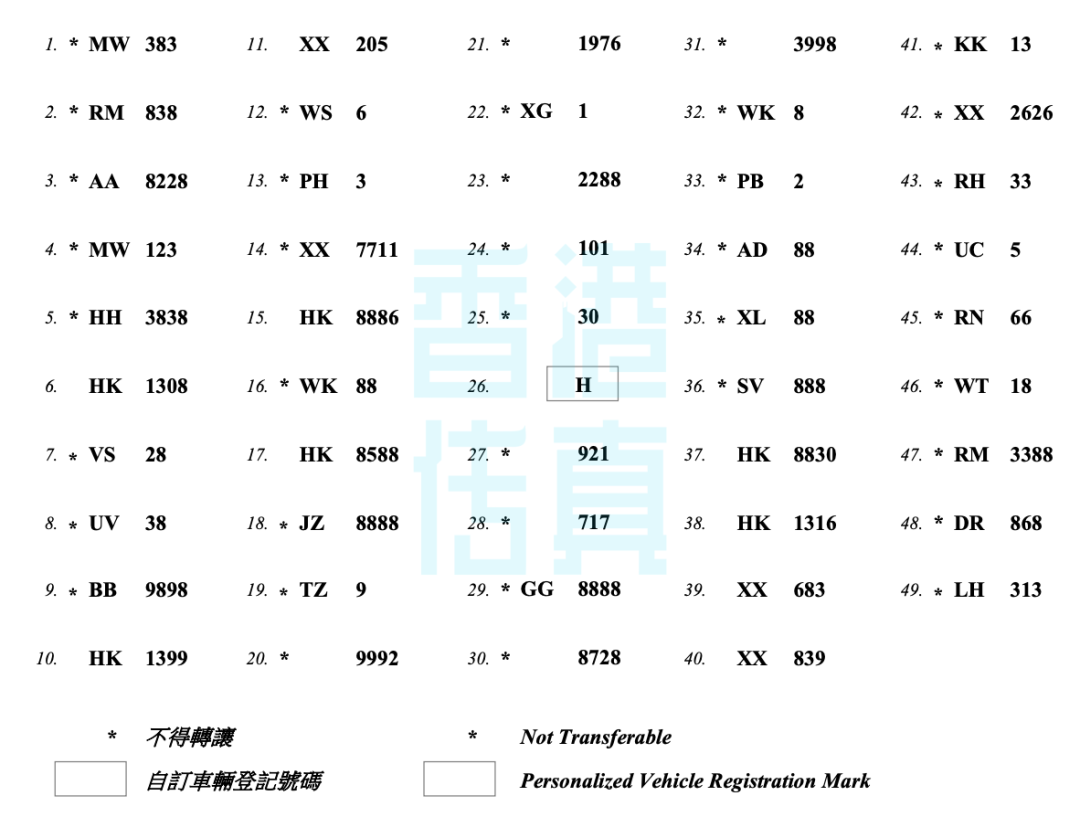 从香港运输署公布的文件可见,这次拍卖的号码中有许多幸运号,比如“GG 8888”、“HK 8886”、“JZ 8888”,还有“AD 88”、“XL 88”、“WK 88”、“SV 888”。等等。不过最受关注的,当属单字母车牌“H”,以及号码“30”。拍卖开始前,就有媒体预计,车牌号“H”起码要卖到一千万港元以上。