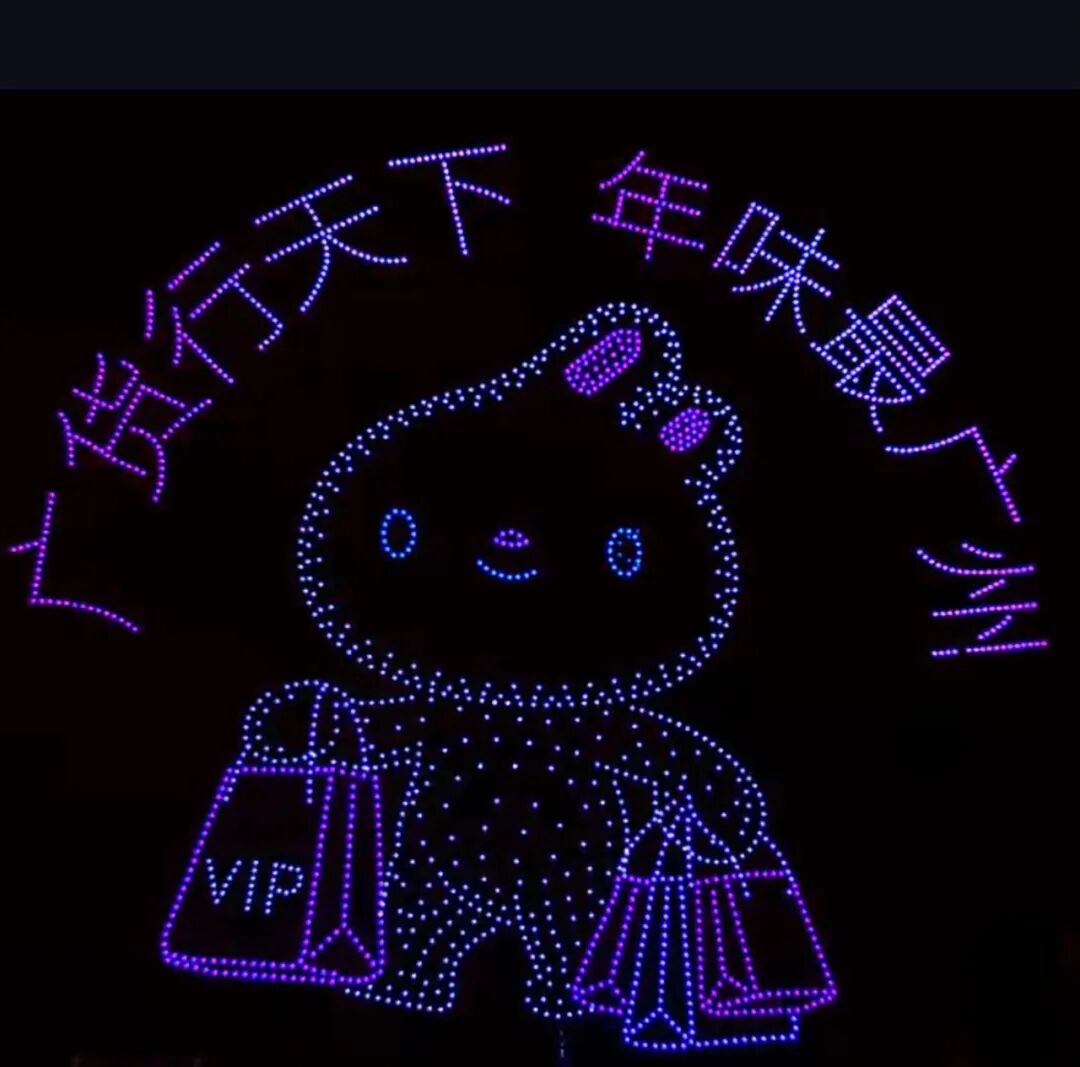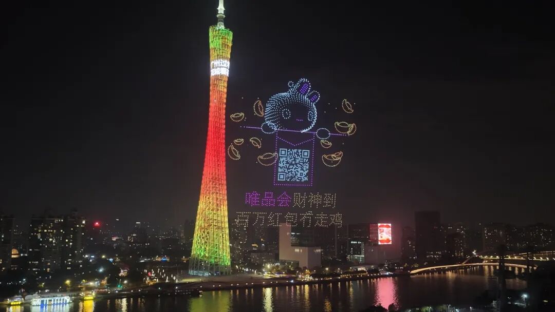 烟花汇演现场的无人机展演首次融入品牌互动信息,将二维码与“广货行”元素巧妙结合,实现线上线下联动,引发用户热烈讨论;
