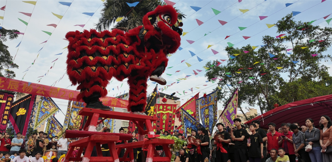 北辰杨公祠前,蚌湖发达祖、蚌湖达远祖、人和新联村、人和黄榜岭村、科甲水、花都杨屋杨一村、九佛山贝村、陈洞高田村、白沙东山祖、白沙曹氏等兄弟村的醒狮队伍受邀前来,与白沙村的醒狮队共贺元宵。