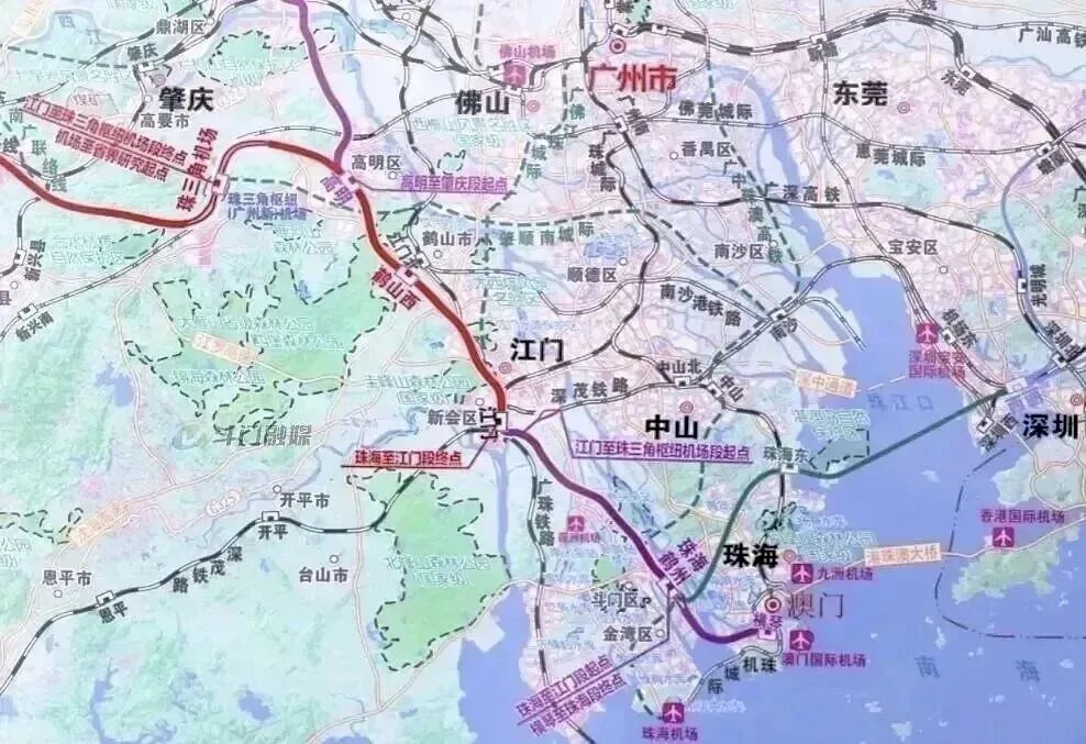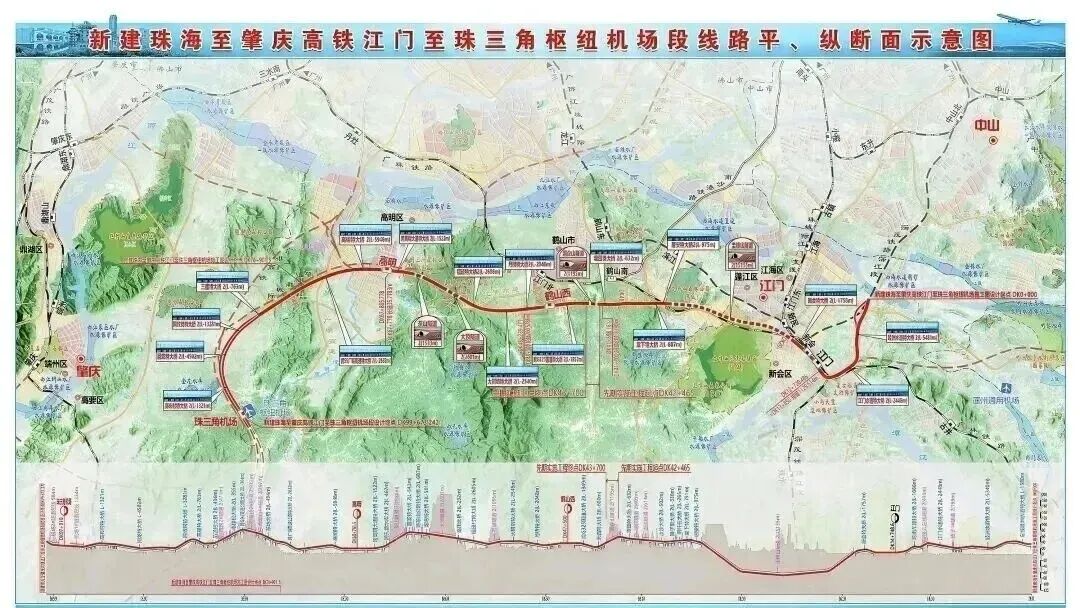 是广东省自主投资建设管理的第一条时速350公里高铁,是珠江两岸协同、高质量发展的重要战略性高铁,连接珠海、江门、佛山、肇庆,主线接入规划中的珠三角枢纽机场,其中江门至珠三角枢纽机场段成为深圳至南宁高铁的重要组成部分。