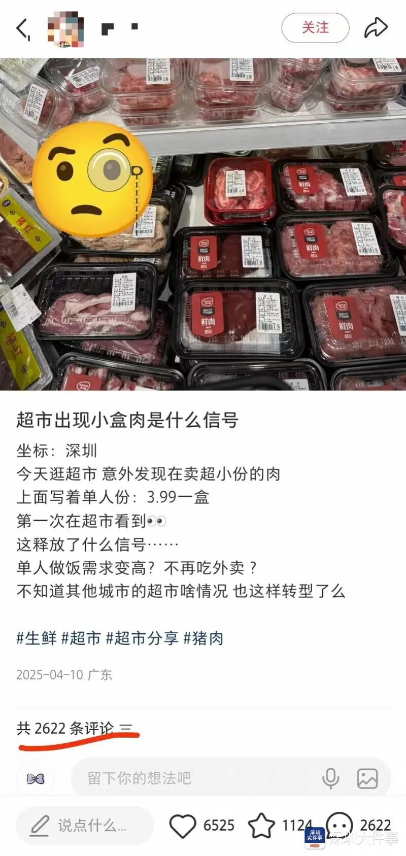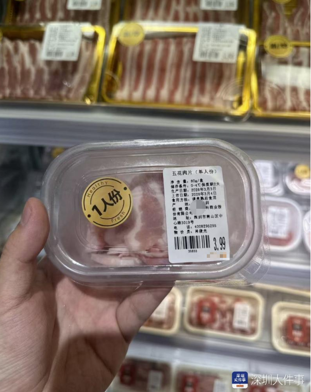 根据网友的晒图,记者找到深圳该大型连锁超市位于深圳龙华的门店,在鲜肉区见到了“一人份”肉品。