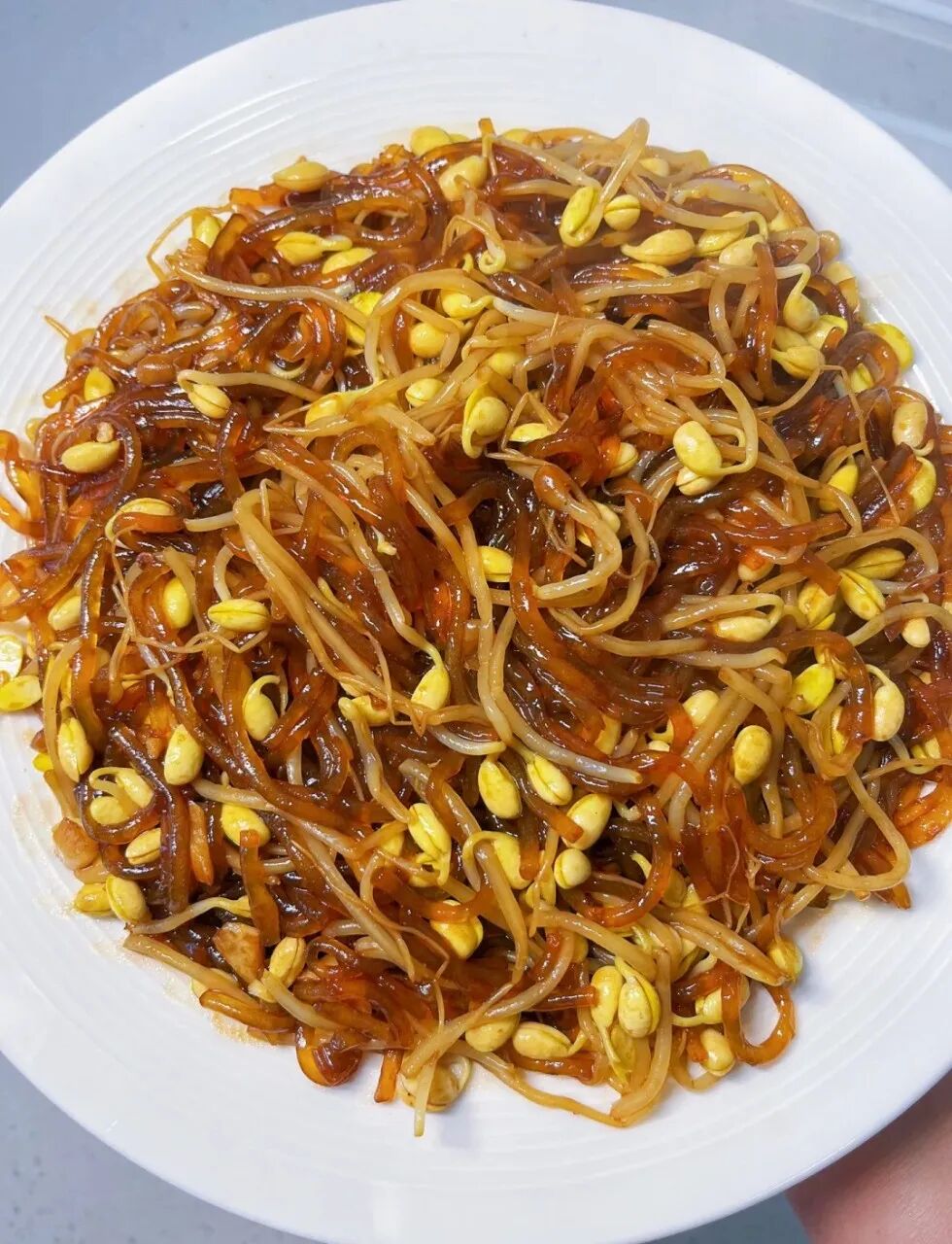 开胃解腻,脆爽可口,超级下饭。 四. 黄豆芽 · 黄豆芽炒粉条 【食材】 黄豆芽、粉条、葱、蒜、生抽、盐、食用油 【做法】 1. 粉条提前泡软,黄豆芽洗净。