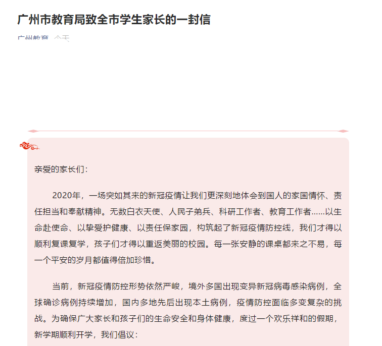 1月14日晚,广州市教育局在官微发布了《广州市教育局致全市学生家长的一封信》。信中有九条倡议,其中建议寒假春节期间尽量在穗过节,非必要不到中、高风险地区,非必要不出境。如必要跨地域出行,请务必提前了解途经地和目的地疫情防控形势和防控政策。 九条倡议如下: 一、理性认识疫情。请持续关注国家、省、市官方发布的疫情防控动态信息,包括中高风险等级信息及确诊病例行动轨迹,做到疫情防控不懈怠、认识疫情不恐慌、正确辨别不信谣、自觉制止不传谣。 二、科学做好防护。养成不乱摸、勤洗手、咳嗽打喷嚏时注意遮挡等卫生习惯,形成“一米线”、公筷制、分餐制的生活方式。加强室内开窗通风,保持空气流通,勤晒衣服和被褥等,做好日常预防性消毒。到人群密集场所、通风不良场所、医疗机构三类场所务必佩戴口罩,在乘坐公共交通工具时,自觉与其他乘客保持间距。 三、配合疫情防控。家长要教育受家乡疫情影响需要留校的学生严格听从学校安排,配合落实校园疫情常态化防控的各项措施,出入校园要主动做好登记。在校期间配合落实晨午晚检制度,一旦出现发热或咳嗽等呼吸道症状,要及时报告老师和指定联系人,并戴好一次性医用外科口罩尽快就医。 广州市学生及共同生活的家庭成员中如有中高风险地区及境外旅居史或重点人员接触史的,请按照相关防疫要求配合社区、村镇、学校做好核酸检测、风险排查、卫生消杀、志愿服务等工作,落实各项防控措施,并主动向居住地社区、个人所在工作单位及孩子所在学校报告。同时,敬请留意并落实学校发布的信息提示内容,配合学校做好假期动向相关排查。 四、加强健康管理。尽可能避免与有呼吸道感染症状(如发热、咳嗽或打喷嚏、流鼻涕等)人员的密切接触。如果家人及孩子出现发热、干咳等症状,请不要自行购买和服用药物,应自觉避免接触他人,规范佩戴口罩后就近前往正规医院发热门诊检查治疗,如实告知医生近期接触史、旅居史等。就医过程中尽量避免搭乘公共交通工具,前往医院途中和医院内应全程佩戴医用外科口罩。 五、养成规律作息。科学安排假期作息时间,保证充足的睡眠时间。督促孩子认真完成体育家庭作业,多进行户外活动,加强体育锻炼,增强个人体质,提高抵抗力。控制孩子使用电子产品的时间,引导孩子养成良好的用眼习惯。 六、减少外出聚集。寒假期间减少串门、少去人员密集场所,减少参加聚会聚餐等集体活动,提倡家庭及私人聚餐等活动控制在10人以下;减少在外进餐次数和时间,减少接触公共物品。 七、合理安排出行。当前疫情防控形势严峻复杂,建议寒假春节期间尽量在穗过节,非必要不到中、高风险地区,非必要不出境。如必要跨地域出行,请务必提前了解途经地和目的地疫情防控形势和防控政策。出行期间注意个人卫生,全程规范佩戴口罩,做好卫生消毒等个人防护,妥善保存行程票据以备查询。同时,做好个人及孩子出行期间的健康监测。 八、关注食品安全。密切关注政府部门发布的进口食品检疫信息,不购买、不食用野生动物及未经检验检疫的食品。注意养成个人良好饮食习惯,食品烹饪前要彻底清洗干净,食物要煮熟煮透。 九、全程跟进实习。提醒准备到岗实习的孩子,要密切关注学校通知要求和企业信息通报,加强沟通联系,全程跟进实习工作。已经在岗实习的孩子要按学校、企业的管理规定,落实好疫情防控、请假销假、安全作业等方面的要求,确保实习工作安全有保障、学习有收获、成长有进步。 来源:信息时报 |