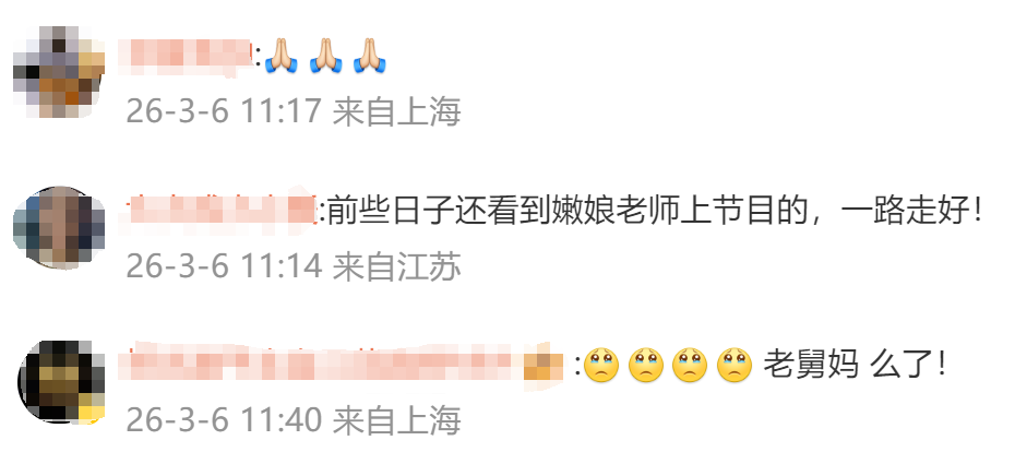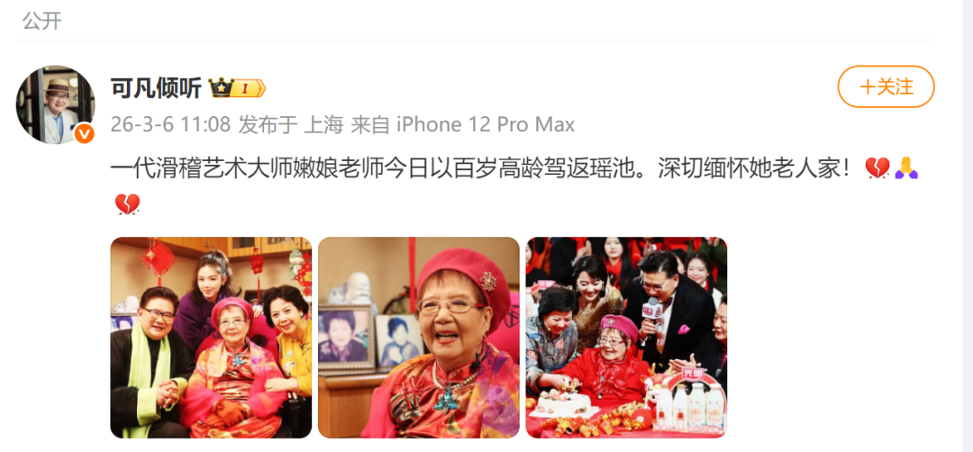 今天,主持人曹可凡发布微博:一代滑稽艺术大师嫩娘老师今日以百岁高龄驾返瑶池。深切缅怀她老人家!