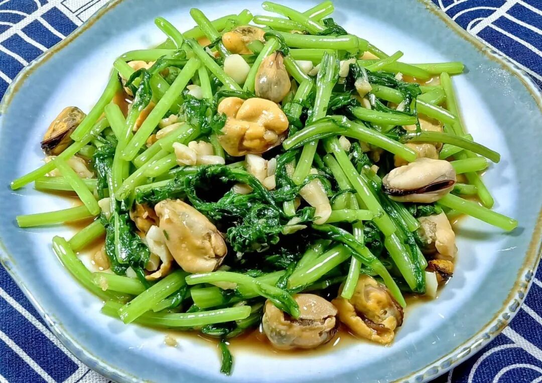 这菜上桌得趁热。茼蒿脆生生,海虹肉软嫩嫩,汤汁是浅杏色的,挂在那一片绿上。夹一筷子,先吃到茼蒿的清香,接着是海虹的海味,两种截然不同的鲜在嘴里撞上,谁也不压谁。剩下那点儿汤,拌米饭能吃两大碗。