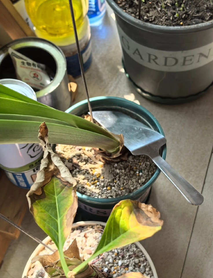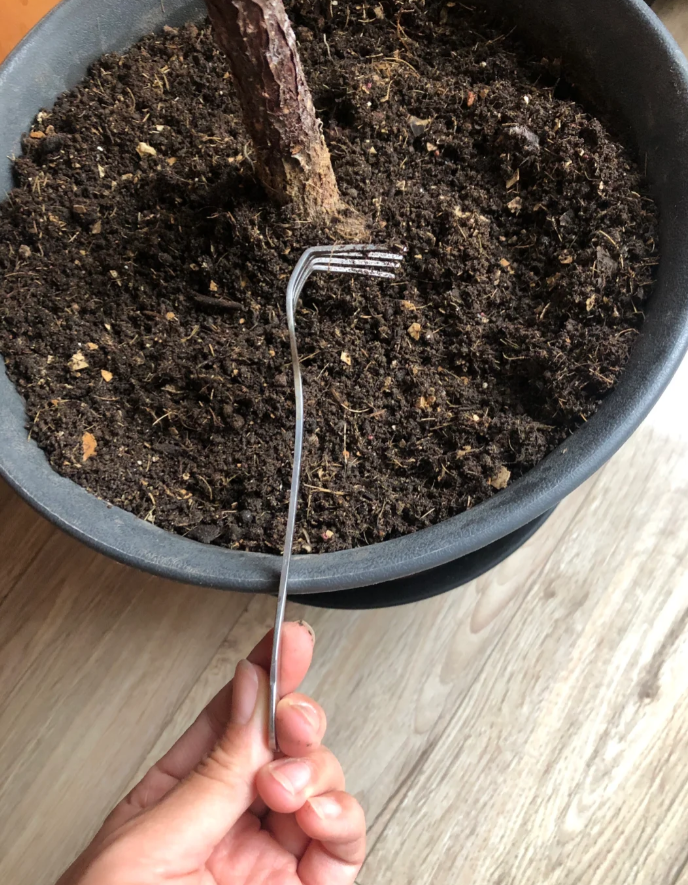 直接把蛋糕刀当“园艺工具”,给花盆里的土壤松土用。
