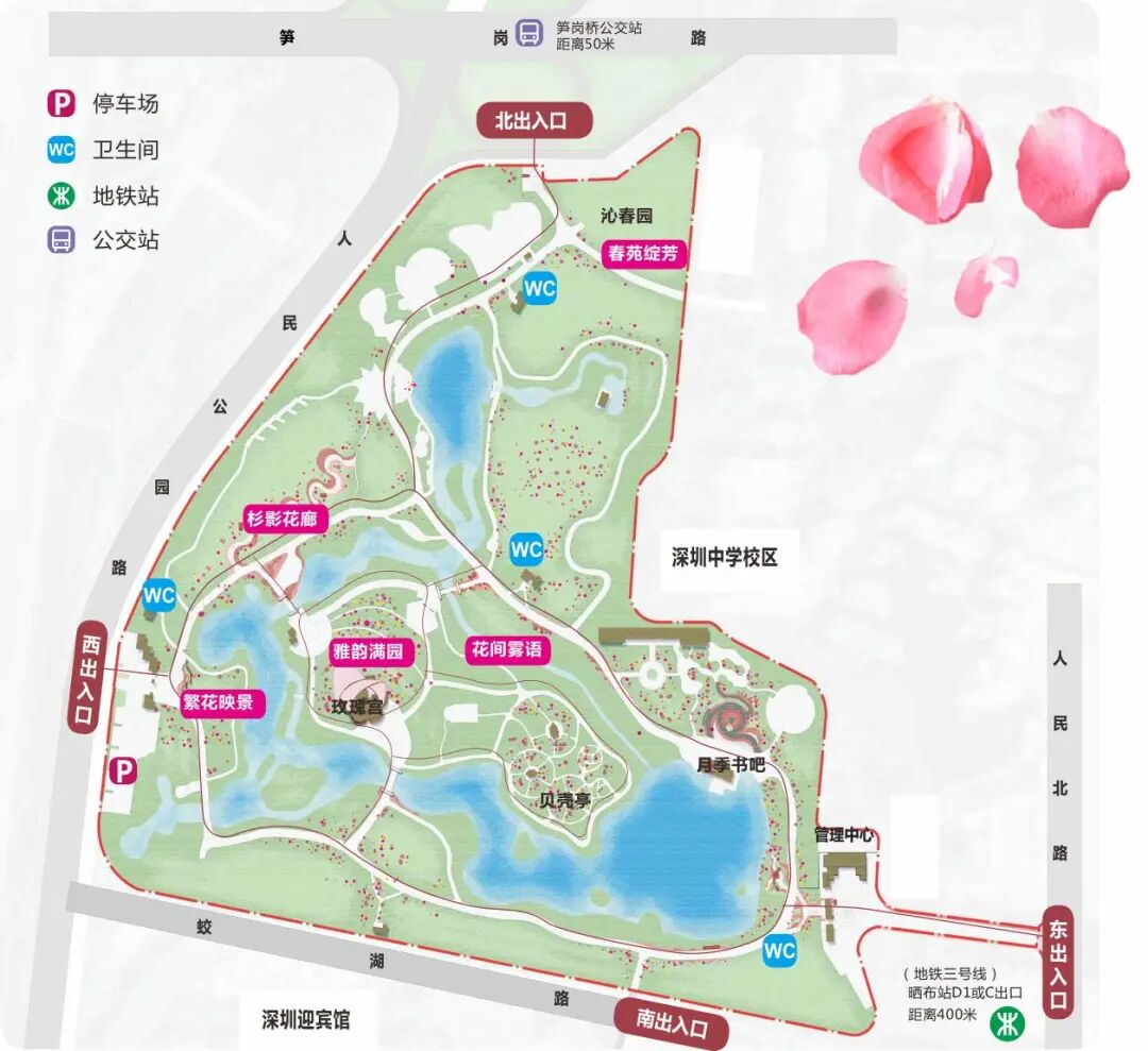 自驾出行:预约停车需提前微信搜索“深i公园”小程序-“香蜜公园一号停车场”进行预约。