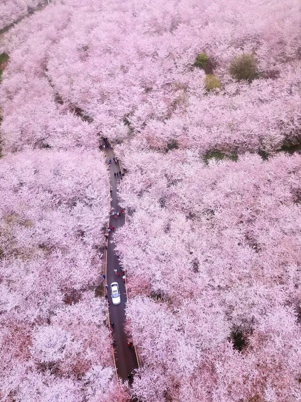 2. 贵州平坝|全球最大的樱花秘境花期:3 月上 —3 月中70 万株樱花漫山遍野,被 BBC 赞为蓝色星球最美春日限定。粉色花浪覆盖山峦与湖畔,开车穿行其间,路两旁皆是樱花云,风过处落英缤纷,不用刻意找机位,随手一拍都是治愈系大片。人少景旷,适合沉浸式拥抱春天。