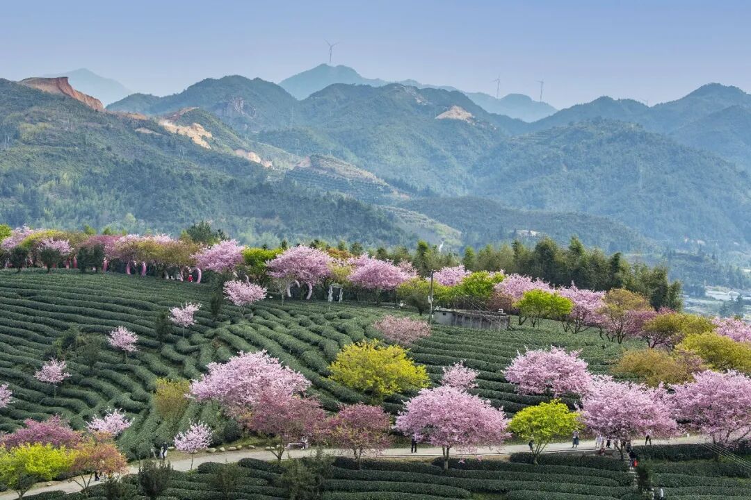 6. 福建永福樱花园|茶田与樱花的童话花期:1 月下 —3 月中10 万株樱花镶嵌在 5 万亩茶园中,粉色花带顺着梯田蜿蜒,像给青山系上丝带。云雾缭绕时,茶香混着花香,坐小火车穿行花林间,治愈又清新,被《中国国家地理》评为中国最美樱花圣地。