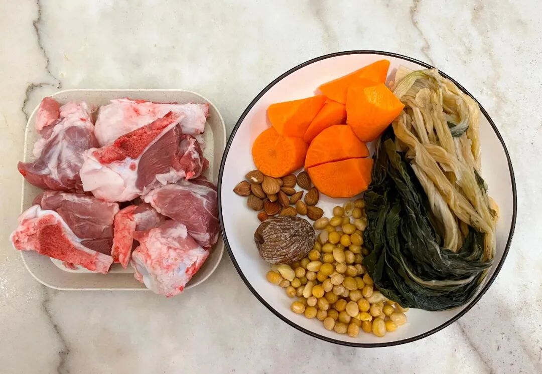 食材:猪骨、白菜干、胡萝卜、黄豆、南北杏、蜜枣