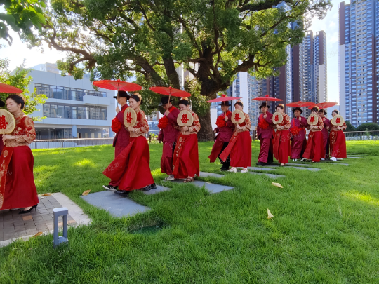 如果说南山荔林诉说着人与土地的羁绊,那么盐田那株521年的古香樟,则见证了人与人之间的情感联结。伫立在盐田区520香樟广场的它,是盐田现存最古老的古树,也因“521”的浪漫树龄,成为远近闻名的“爱情树”。“古树见良缘・婚约定盐田”,一场场疍家特色集体婚礼在这里圆满礼成。新人们身着疍家传统礼服,梳发髻、插银花,遵行“采花抽礼、咸水歌对唱、撑娘伞、合卺礼”等传统婚俗,在古香樟的浓荫下许下一生的诺言。这株古樟,既见证了盐田疍家人依海而居的岁月变迁,又以全新的方式承载着年轻人对爱情的美好期许,让古树保护有了更温暖的人文底色,也让濒临失传的疍家婚俗在绿意中焕发新生。