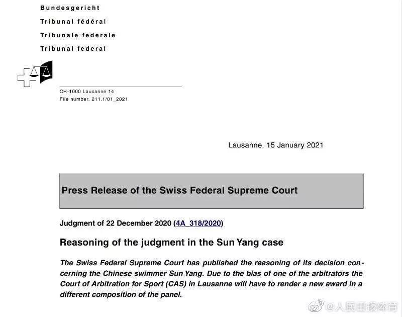 瑞士当地时间1月15日,瑞士联邦最高法院发布新闻公报,由于国际体育仲裁法庭仲裁小组中的一名仲裁员存在偏见和歧视,瑞士联邦最高法院决定撤销国际体育仲裁法庭对中国游泳运动员孙杨的8年禁赛处罚,国际体育仲裁法庭需要组建一个新的仲裁小组重新作出判决。 去年12月24日,瑞士联邦最高法院曾发布新闻公报,宣布撤销国际体育仲裁法庭对孙杨的禁赛处罚,但并未公布原因。本次公报则是瑞士联邦最高法院首次公布撤销上述判决的原因。 2020年2月28日,孙杨因兴奋剂违规被国际体育仲裁法庭禁赛8年,孙杨就此判决向瑞士最高联邦法院提出上诉。公报中显示,孙杨在上诉申请中指出,其本人于2020年5月中旬在互联网平台上注意到的一篇文章显示,国际体育仲裁法庭此案中的仲裁小组主席弗拉蒂尼存在偏见和歧视。这篇文章的内容中包含了弗拉蒂尼于2018至2019年间在个人社交媒体平台上就动物保护方面发表的一系列言论,其中对中国人使用了歧视性语言。 瑞士联邦最高法院认为,孙杨的调查举证合规有效。通过调查相关言论,瑞士联邦最高法院认为该仲裁小组主席一系列充满暴力的表述明显存在问题,其中一些表述明确地指向了中国人的肤色。而且,部分存在问题的表述甚至是在其已经被任命为孙杨案仲裁小组主席后所发表的。因此,瑞士联邦最高法院支持了孙杨对于该仲裁小组主席公正性的质疑,撤销了国际体育仲裁法庭的禁赛判决。国际体育仲裁法庭需要重新组建仲裁小组审理此案并作出判决。 来源:人民日报体育 |