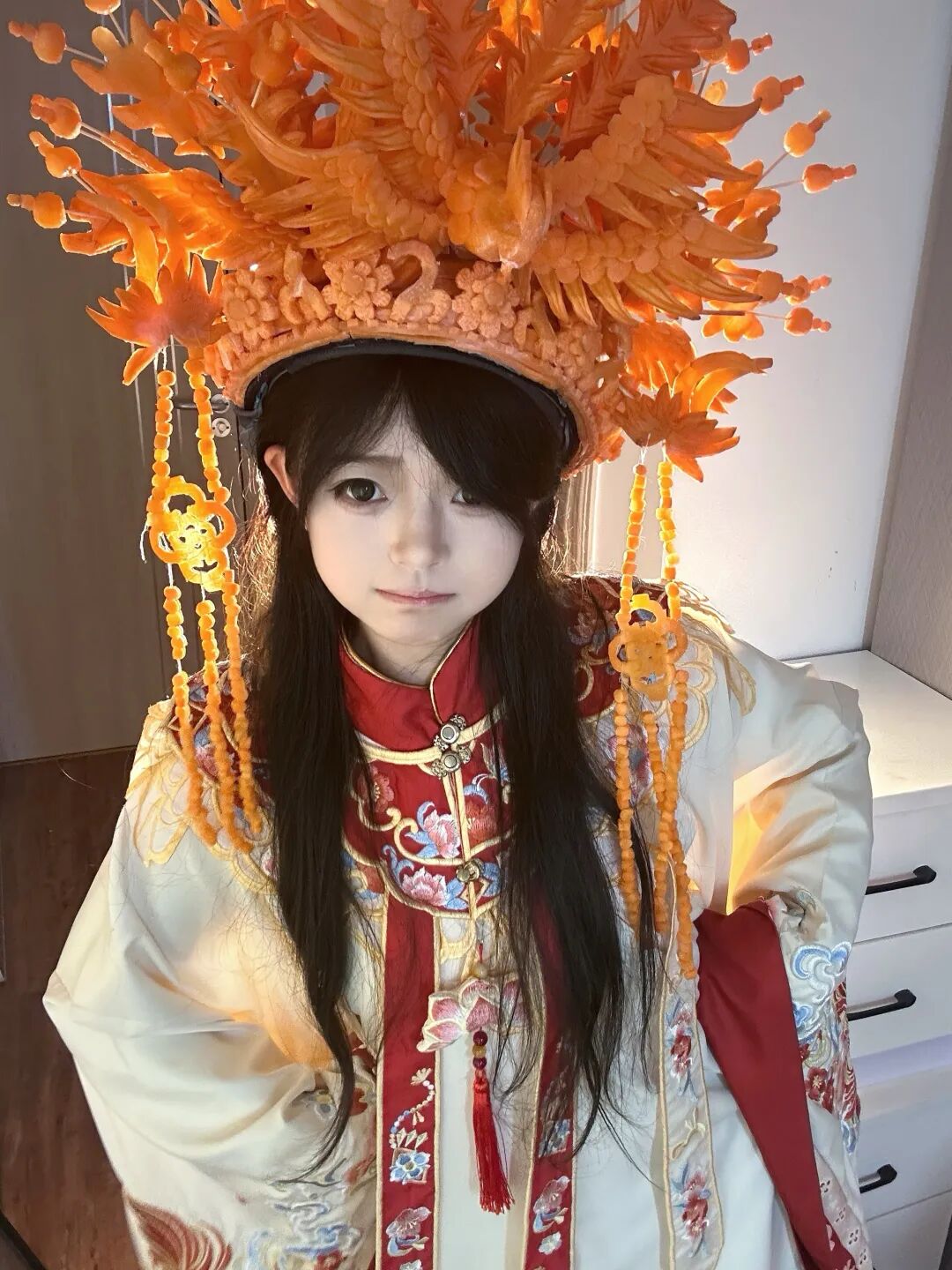 她的创作材料以新鲜生胡萝卜为主。陈琴表示,白萝卜、青萝卜也曾尝试,但食用后易刺激肠胃,而胡萝卜质地软硬适中、颜色鲜亮、便于塑形和保存,因此成为固定原料。创作时,她不提前切割,直接用门牙、犬牙配合啃咬、打磨。精细部位则放慢速度,用牙尖一点点雕琢,全程凭手感和经验把控造型与细节。