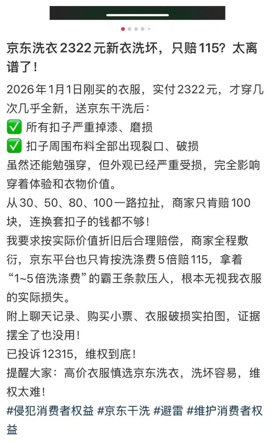 近日,多名网友反映在京东下单洗衣,取衣服时发现衣物被洗坏。九派新闻记者注意到,一名网友发帖称价值2322元的衣服因洗涤不当造成损坏,扣子出现掉漆、磨损,扣子周边布料也出现裂口。事后,京东方愿意赔付115元,对于此方案该网友感到难以接受。