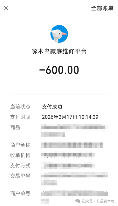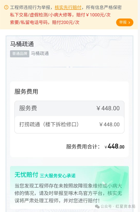消费者杨女士也有类似经历。2月18日,因家中马桶堵塞,她在啄木鸟平台下单了马桶疏通服务,在未对马桶堵塞情况详细了解的情况下,维修师傅给出了448元的报价,其中100元为春节服务费。
