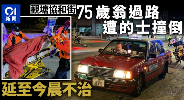 觀塘昨日(13日)發生車禍,75歲老翁在觀塘協和街被一輛的士撞倒,傷者送院搶救,延至今日(14日)早上9時17分不治。
