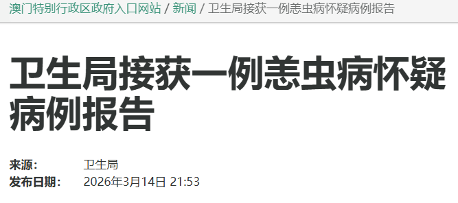 3月14日,澳门特区政府卫生局通报,接获1例恙虫病(又称丛林斑疹伤寒)疑似病例报告,这是澳门今年第1例恙虫病疑似病例,为输入性病例。