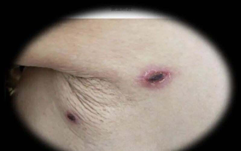 最典型的症状是在叮咬处形成的焦痂,它呈圆形或椭圆形,直径约1至15毫米,边缘稍隆起,周围有红晕,中央凹陷覆盖黑色痂皮,像一个小小的“火山口”。焦痂常位于身体潮湿、隐蔽、皮肤柔软处,如腹股沟、腋窝、会阴部等,极易被忽略。