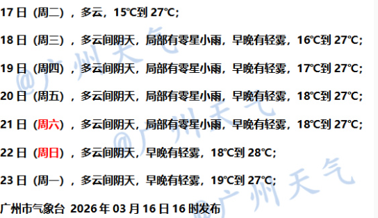 3月17日,广东中西部市县多云间阴天,早晨有轻雾,局部有零星小雨,其余市县晴转多云。最低气温:粤北、珠三角北部和西部、粤东偏北市县12~16℃,雷州半岛市县19~21℃,其余市县16~19℃。