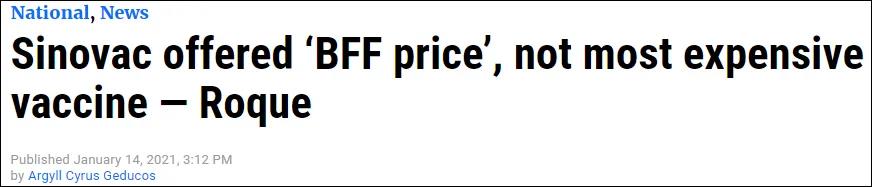 “菲律宾(在购买科兴疫苗时)拿到了‘至臻友情价’(at a BFF price)。” 14日,菲律宾总统府驳斥了有关中国科兴公司新冠疫苗是市场上最昂贵疫苗的报道。 报道截图 据菲律宾《马尼拉公报》1月14日报道,由于保密协议,菲总统府发言人洛克(Harry Roque)并未透露科兴疫苗的实际价格。 但他在周四表示,有关科兴疫苗是市场上最贵疫苗的报道,只是菲政府批评者精心策划的花招。 “科兴疫苗不是最贵的。这是反对派搞起来的事。”洛克说。 “它甚至不是我们将要购买的疫苗中第二贵的。如果我没记错的话,它的价格在六款疫苗中排第三位。” 此外,根据洛克的说法,菲律宾拿到了适合“最好朋友”之间的大众价格。 洛克 图自马尼拉公报 另据《马尼拉时报》1月14日报道,菲政府已经从科兴订购了2500万剂科兴“克尔来福”疫苗,首批5万剂将于下月送达。 此外,菲政府还订购了印度血清研究所生产的3000万剂Covovax疫苗,与英国阿斯利康公司的2000万剂疫苗订单则将于本周完成。 菲律宾计划,在今年为全国三分之二、约7000万人口接种新冠疫苗,医护人员、老年人、贫困人群等将优先接种免费疫苗。 值得注意的是,当地时间12日,洛克已经表示,今年6月前,科兴新冠疫苗将是菲律宾民众接种的唯一选择。 据菲律宾ABS-CBN新闻网报道,第一批科兴疫苗将于2月抵达菲律宾,而西方制药厂的疫苗只能等到6月才能提供。 面对国内部分人的质疑,菲律宾总统杜特尔特在13日晚的电视讲话中,向民众传达了对中国疫苗的信心:“他们又不笨。中国人聪明,如果这事不是安全可靠、万无一失的话,他们不会冒险(生产疫苗)。” 来源:观察者网 |