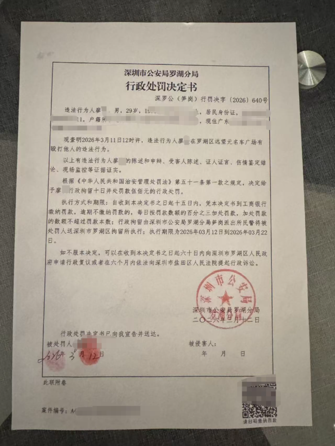 “铁铁”报警并前往相关机构进行伤情鉴定,所受损伤程度为轻微伤。警方出具的行政处罚决定书载明,违法行为人廖某有殴打他人的违法行为,依据相关法律法规,决定对廖某处以行政拘留10日,并处500元罚款的行政处罚。