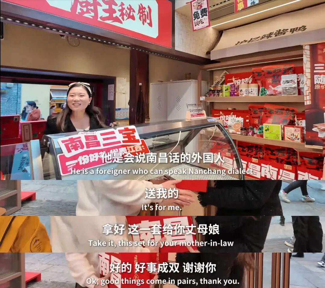 逛万寿宫时,巩义森被店主认出:“他是会说南昌话的外国人!”他谦虚地用南昌话回:“只会一点,说得不标准。”老板娘硬塞给他两袋“南昌三宝”:“一袋给你,一袋给丈母娘!”他连连道谢:“谢谢你!回去一定吃,尝尝江西风味。”