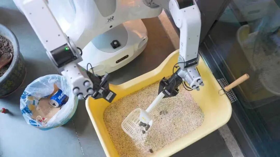 清理完杂物后,机器人切换模式,擦拭桌面、清理宠物猫砂,一气呵成。在卧室,它更是与保洁阿姨组成“黄金搭档”,各执被角将被子叠得方方正正。服务尾声,机器人还细致地检查垃圾桶,套上新袋,将垃圾袋拎至门口。