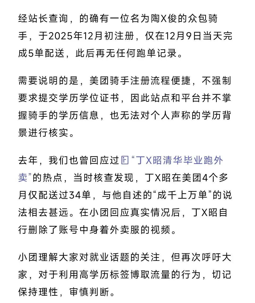 平台同时表示,骑手注册流程无需提交学历证明,无法直接核实其北大毕业的学历背景。